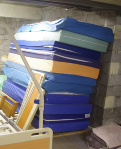 - à l’étage, nous disposons de plusieurs salles, qui furent chacune une chambre d’hôpital pour 2 personnes. Et cet ensemble est donc libre pour que nous y déposions tout ce que l’on nous donne et qui n’est pas trop lourd : matelas, tables de nuit (ou tables de chevet), mini-bureaux en bois verni (1m de long, avec 1 petit tiroir), fauteuils et autres matériels de santé dont les consommables.